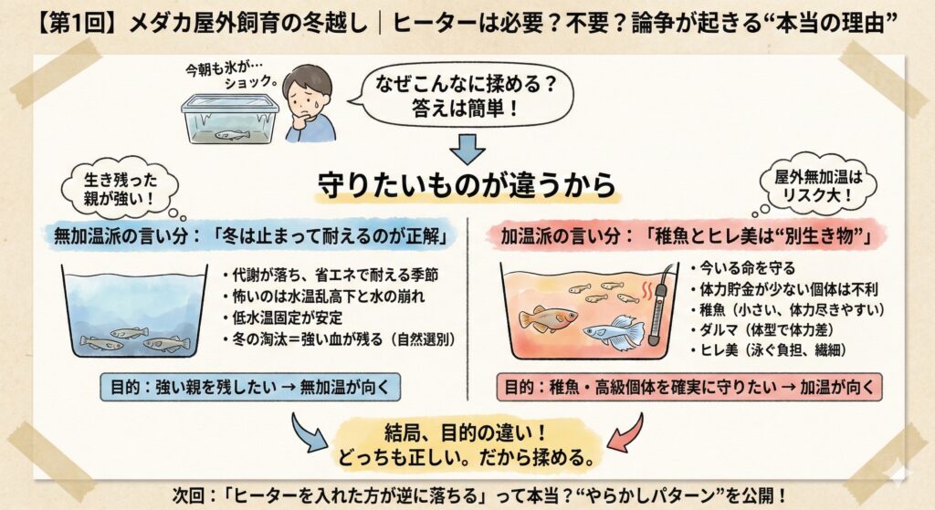 【ヒーター論争(1/3)】メダカ屋外飼育の冬越し|ヒーターは必要?不要?論争が起きる“本当の理由”