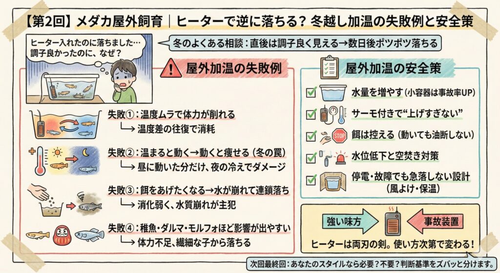 結論から言うと、ヒーターが悪いというより屋外加温は事故が起きやすい構造なんです。