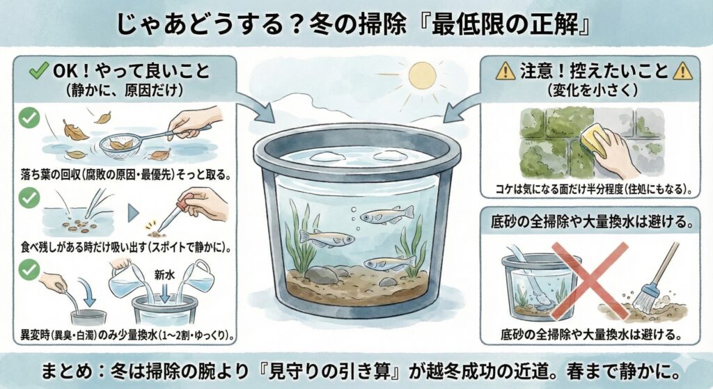 やるなら“原因だけ静かに取る”。落ち葉と残餌を中心に、変化を小さく。冬は掃除の腕より、見守りの引き算が越冬成功の近道です。