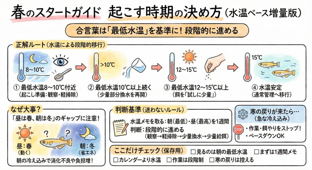 • 最低水温が8〜10℃付近になってきた:起こし準備(観察・軽い掃除)