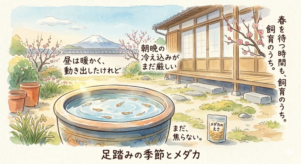 メダカは水温が上がってくると少しずつ活動を始めます。こちらもその様子を見ると、つい餌を与えたり、本格的に春の管理へ移りたくなったりします。でも、ここで焦るのがいちばん危ないところです。昼に暖かくなって動きが出ても、夜にまたぐっと冷え込むような日が続くと、体への負担が大きくなります。