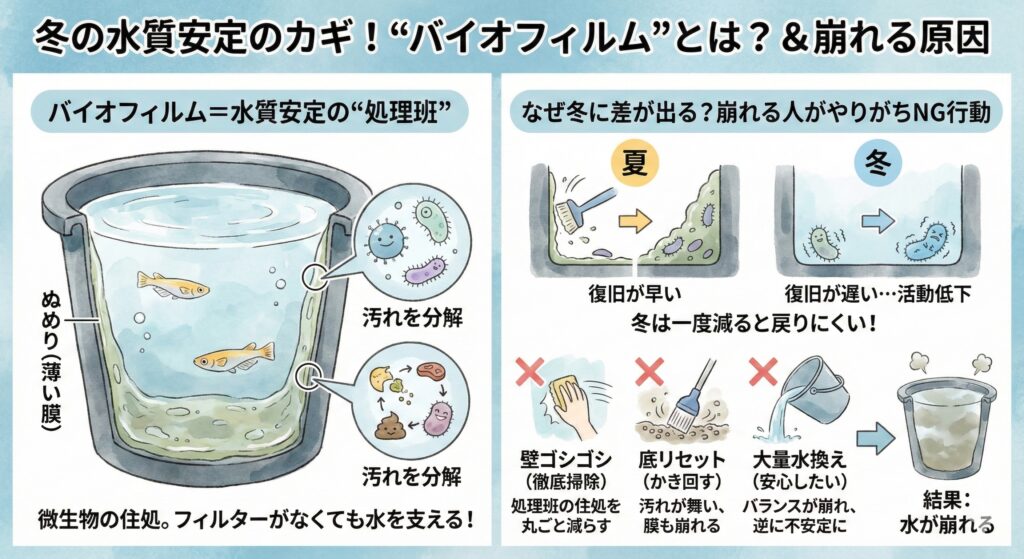 バイオフィルムは汚れではなく、水を守る仕組みの一部。冬はその復旧が遅いからこそ、守った人が勝ちます。