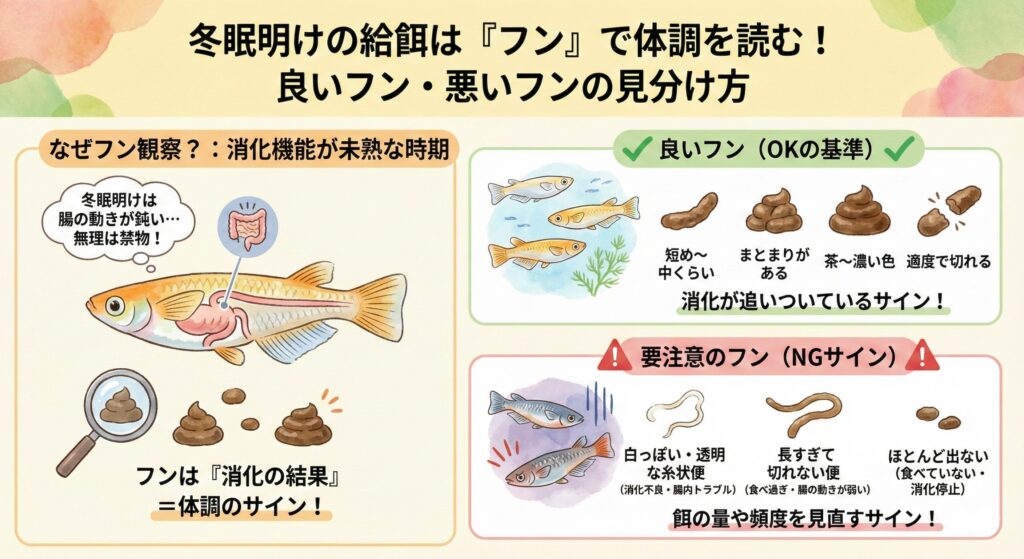 水温が低い時期は代謝が落ち、腸の動きも鈍くなります。起き始めの時期に餌を多く入れると、未消化のまま腸に負担がかかり、体力を削ったり、水を汚して環境悪化につながることも。フンを見れば「量」「形」「色」「切れ方」から、消化が追いついているか、腸が荒れていないかを判断できます。