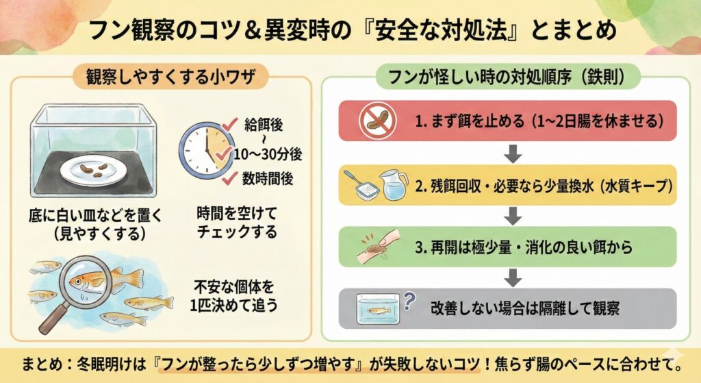 フンに異変が出たら、いきなり薬や大換水に走らず、次の順で落ち着いて対応します。